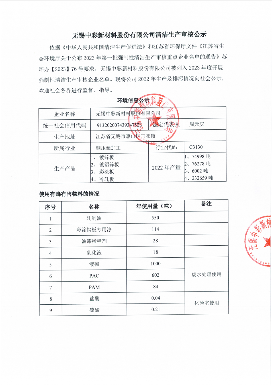 無錫中彩新材料股份有限公司被列入2023年度開展強(qiáng)制性清潔生產(chǎn)審核企業(yè)名單?,F(xiàn)將公司2022年生產(chǎn)及排污情況向社會(huì)公示,歡迎社會(huì)各界進(jìn)行監(jiān)督、指導(dǎo)。